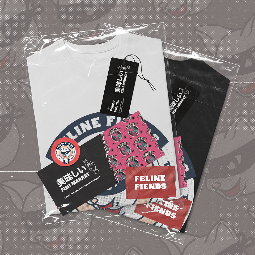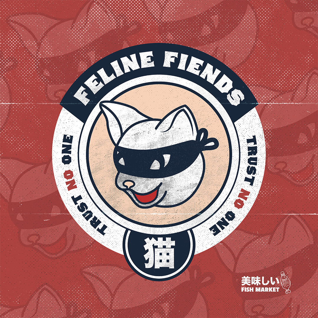 “Feline Fiends” - a bold hand-drawn illustration of a cat wearing a bandit mask, framed by the phrase “Trust No One.” Set against a striking red background, this piece blends character design, attitude, and graphic poster style.