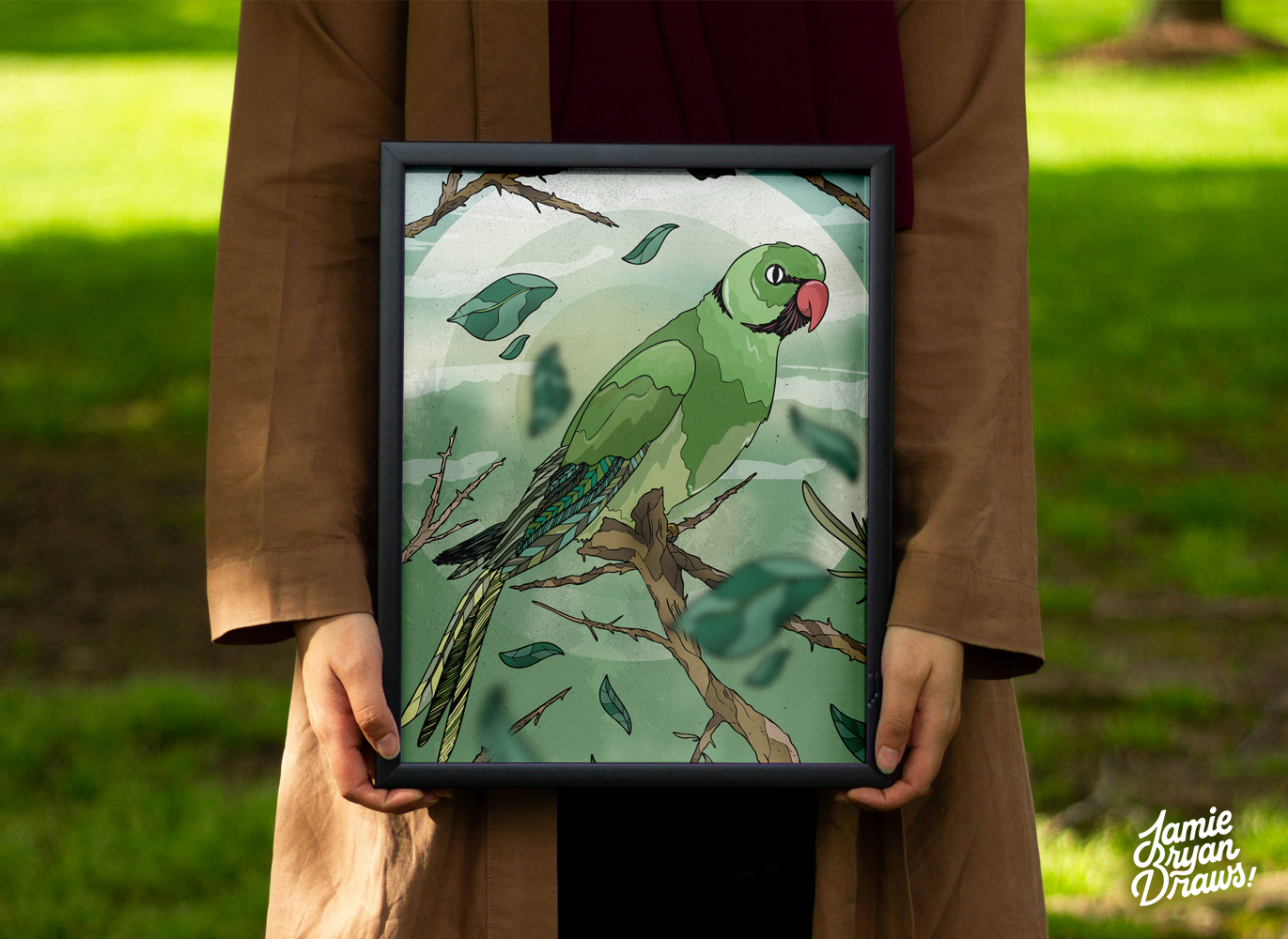 The Ring Necked Parakeet Fine art giclee print, available to purchase in a variety of sizes on premium, heavyweight stock.