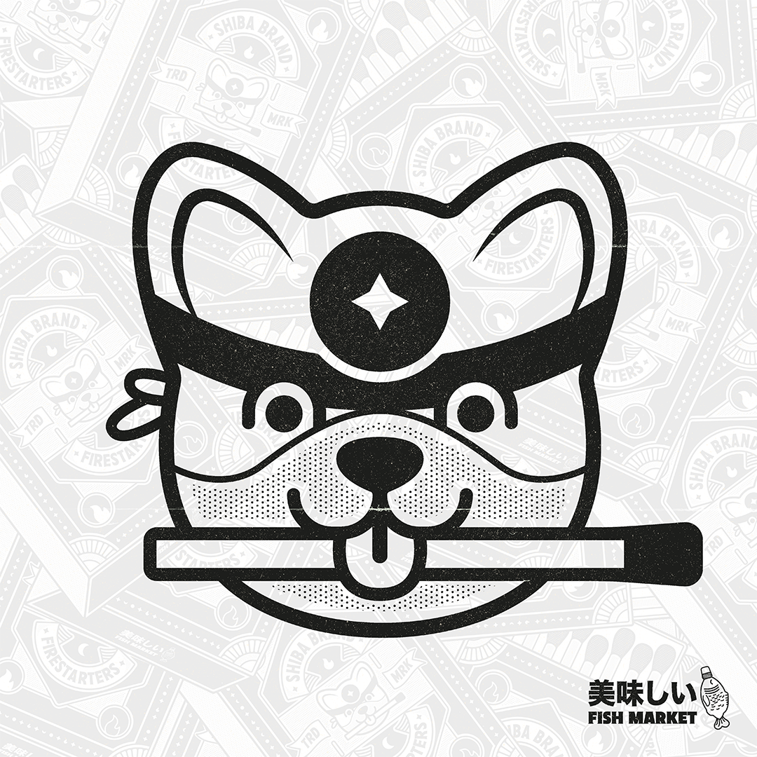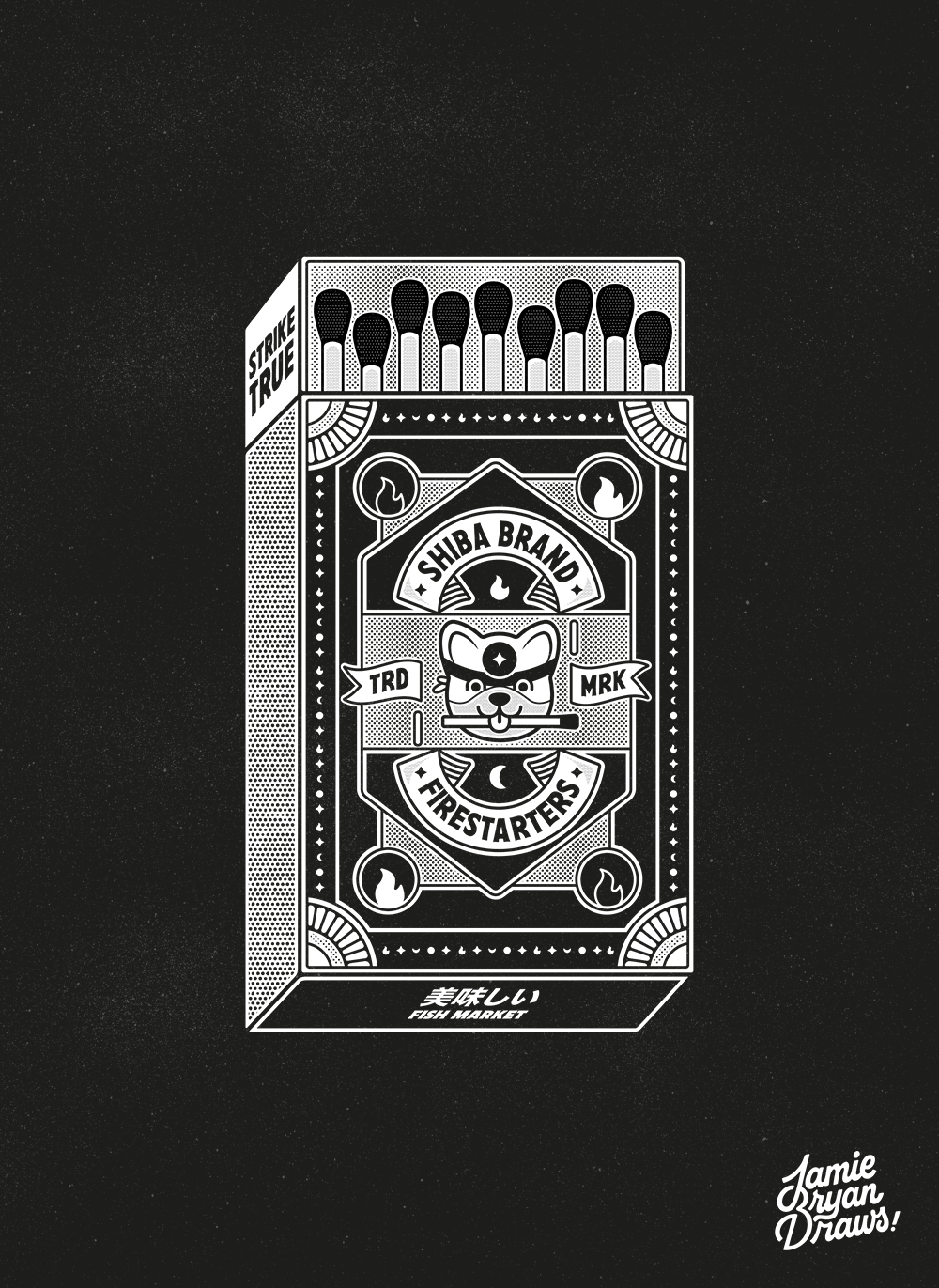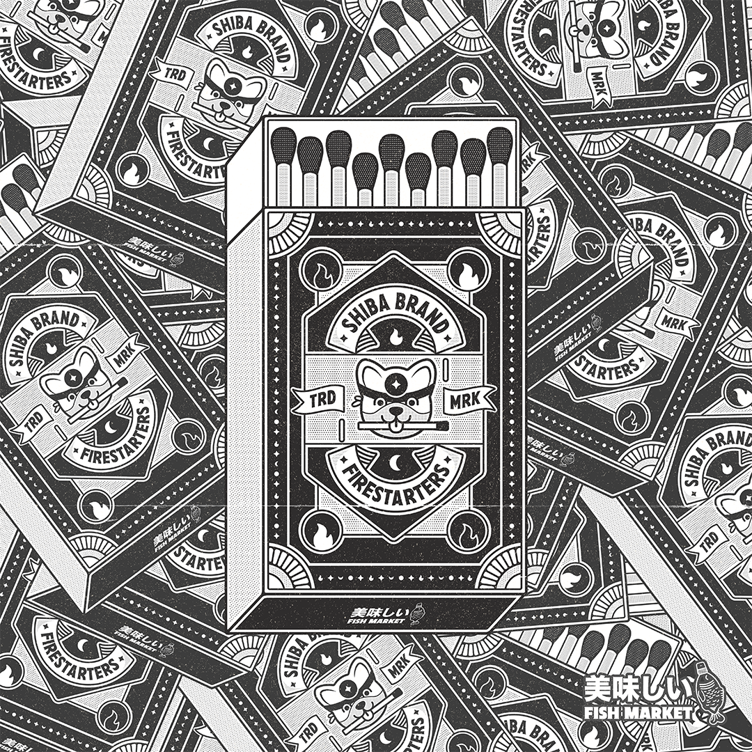 “Shiba Brand Firestarters” — a bold black and white illustration inspired by vintage matchbox designs. Featuring a Shiba Inu mascot proudly holding a lit match, this piece combines nostalgic packaging aesthetics with modern character design flair.