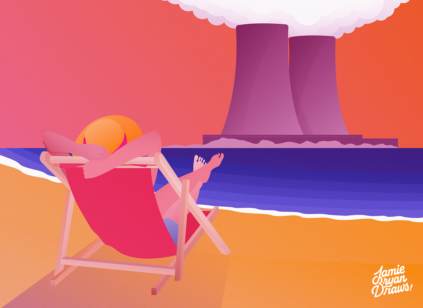 This piece explores contrast and narrative through vector illustration. A woman relaxes in a deck chair on the beach, yet the distant powerplant pumps out toxic fumes, creating tension between serenity and industrial impact. Using simplified vector forms with careful shading, I aimed to balance clarity, mood, and commentary, emphasizing storytelling through minimalism.