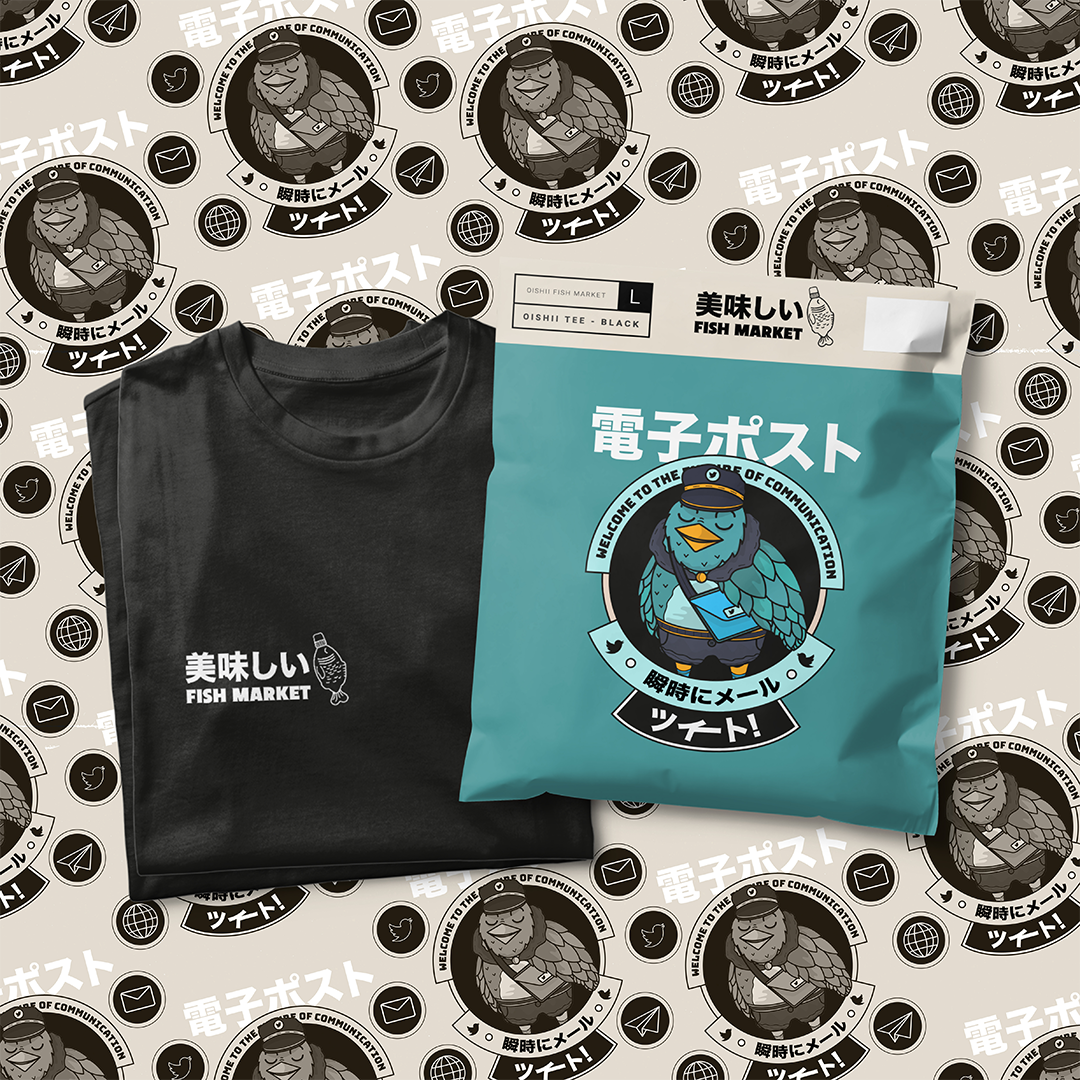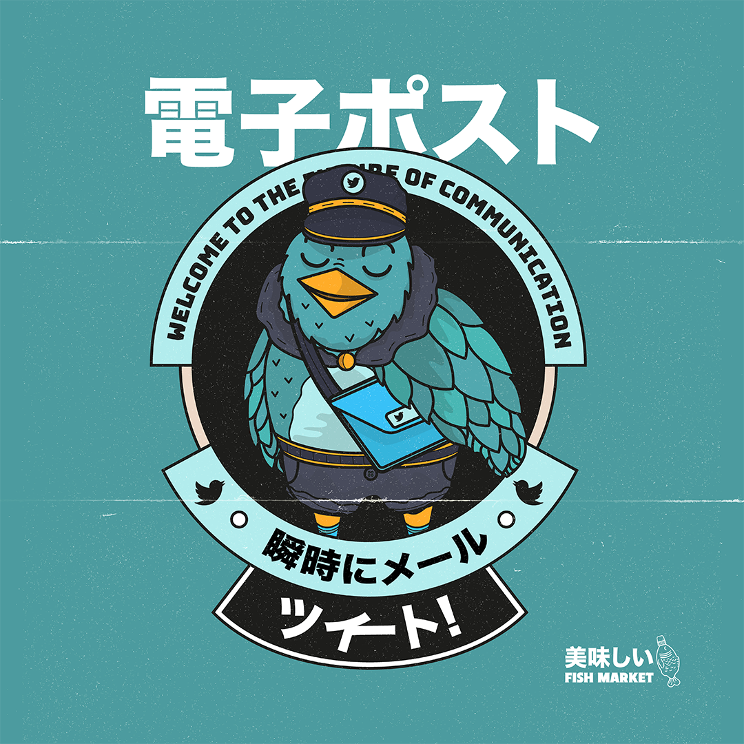 “The Future of Mail Delivery” - a Japanese nostalgia-inspired poster reimagining communication through a witty lens. A blue bird postal worker delivers letters in a tongue-in-cheek take on social media and the evolution of mail. Retro-futurist humour meets vintage poster charm.